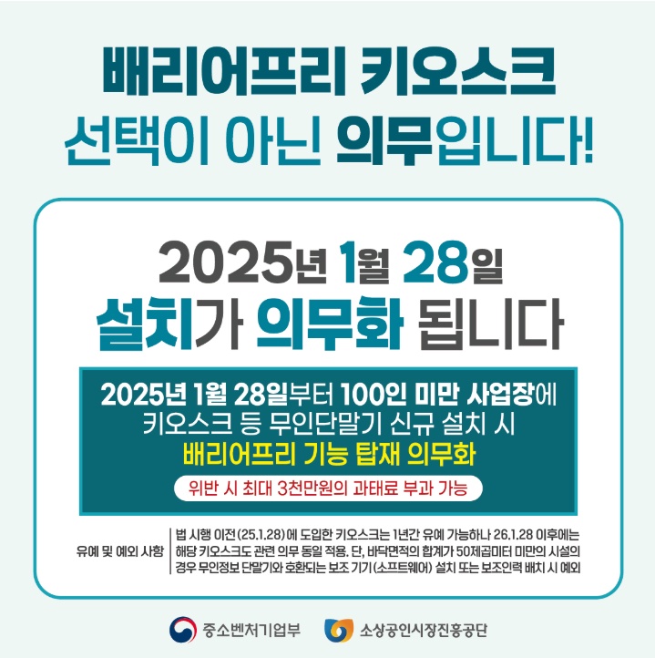2025년 1월 18일부터 100인 미만 사업장에 배리어프리 키오스크 설치가 의무화됩니다. 이 글에서는 배리어프리 키오스크 의무화에 대한 모든 것과 정부 지원금을 받는 방법을 자세히 안내하여 소상공인 여러분의 부담을 덜어드리고자 합니다.